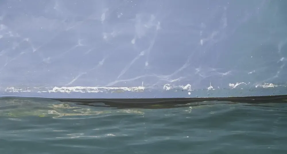 The artwork is a photograph of the hull of a boat and its reflection on the water. The artwork is inspired by and reflects on the traditions of the the Australian landscape artists such Fred Williams, Russell Drysdale and Tim Storrier.