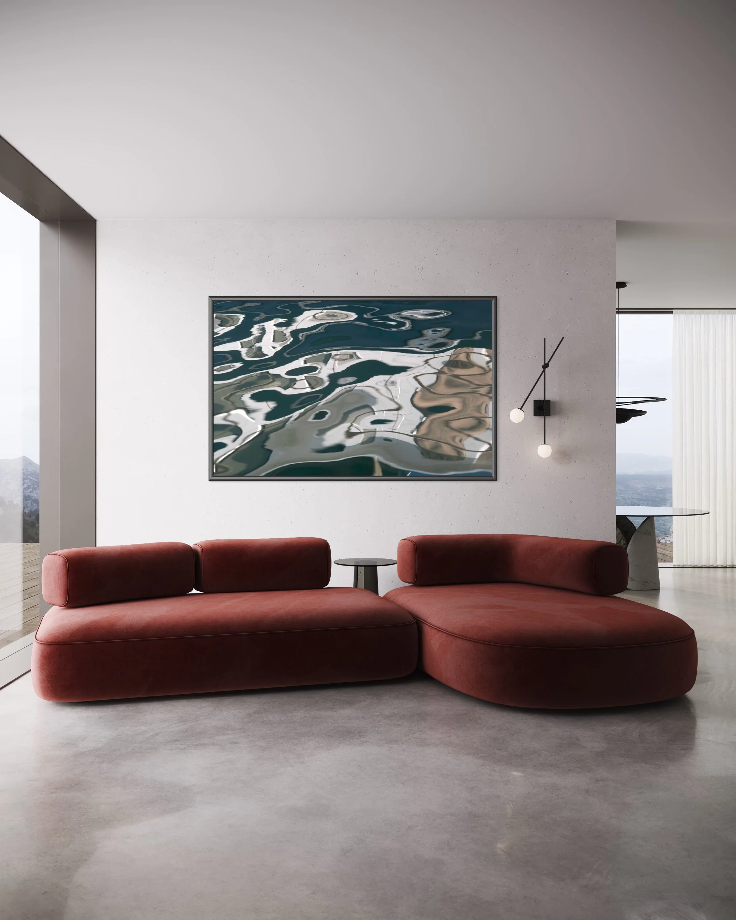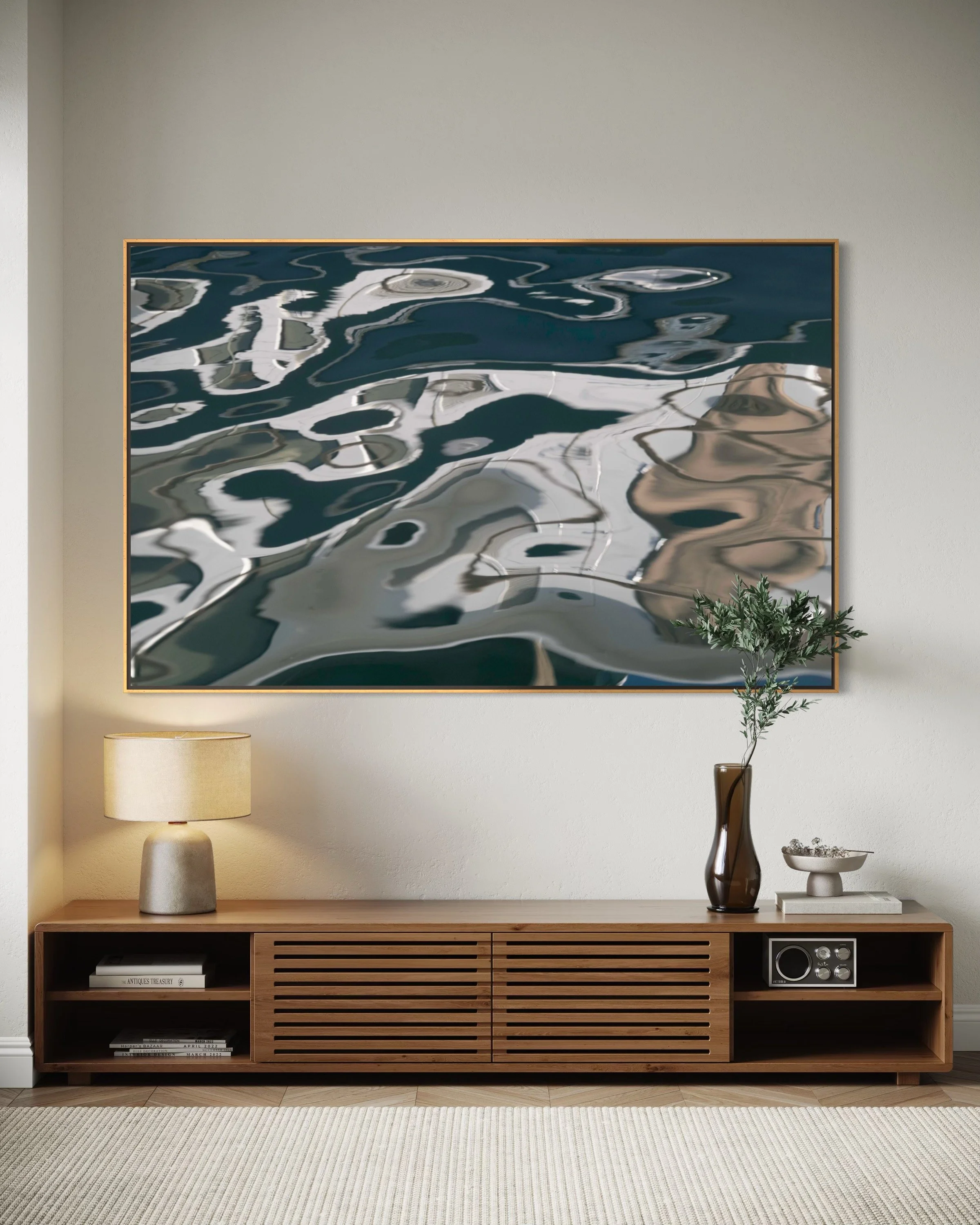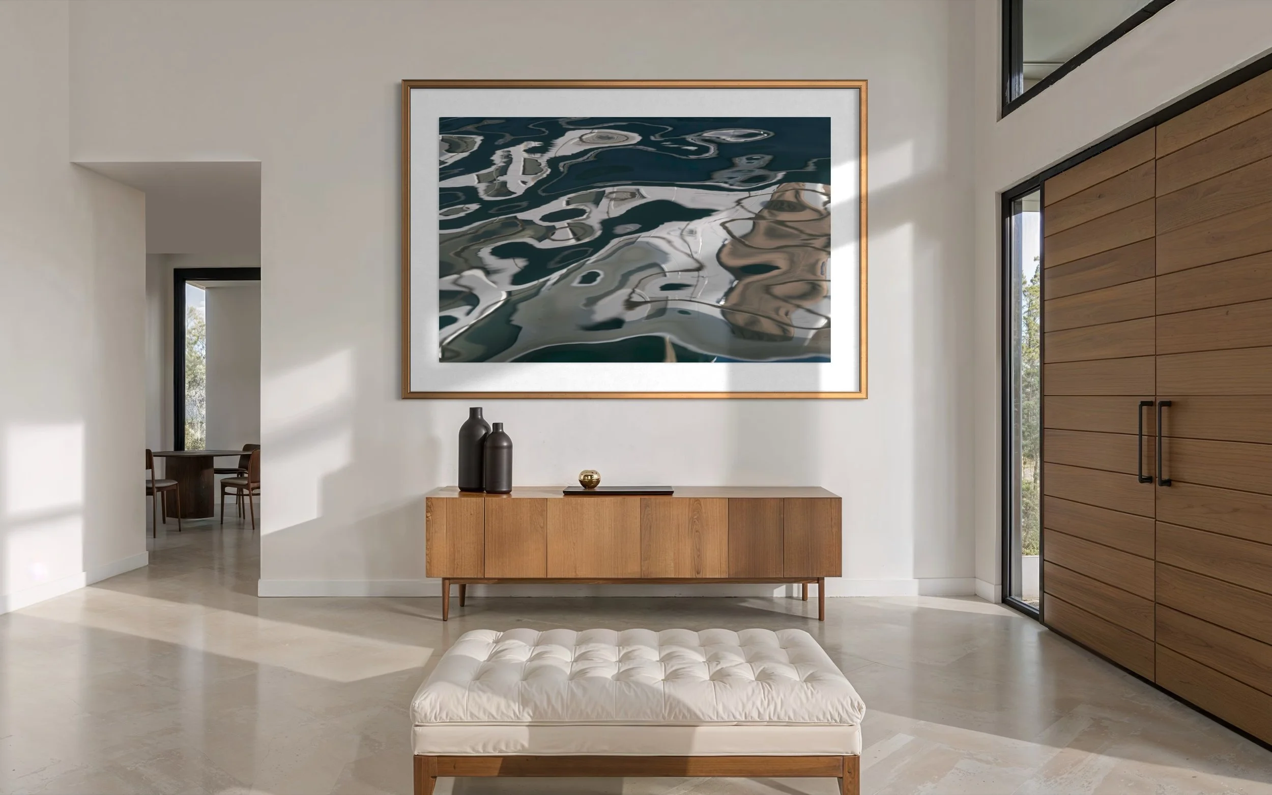 The Aerial & Earth series reveals distant horizons and intricate ecological details within the reflective surface of water. These artworks transform reflections into landscapes of endless imagination, showcasing a mesmerising interplay of shapes, colours, light, and form. Each piece offers an invitation to visual meditation, encouraging viewers to discover a boundless world within the small and often overlooked.