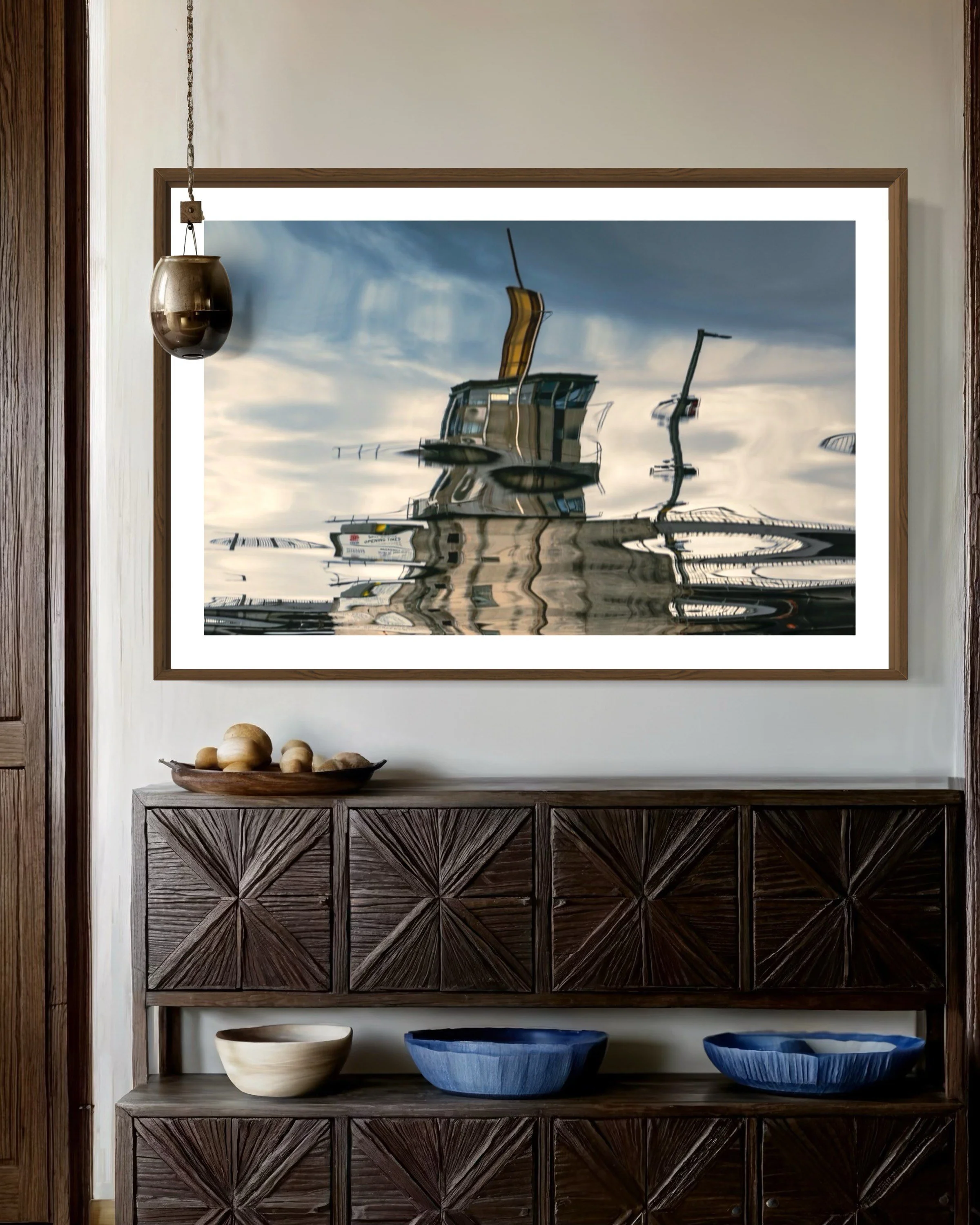 One such Sunday morning Ralph was religiously paddling between Seaforth and Castlecrag; the waters were mercurial, not a breath of wind nor a cloud in the sky. Suddenly he was stuck by an image waving at him through the water as if in a mirror gently rolling with the swell. It was the reflection of a moored yacht. The vividness of the image left him spellbound. Eventually he reached for his phone, opening his camera app. framed-up the image took a snap and promptly forgot about it.