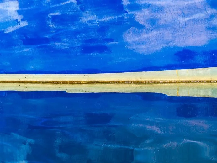 The liminal edge of the sea, especially when viewed from a low-slung kayak, brings into focus questions about the precise nature of reality. Where does one element end and the other begin? Such musings are hard to ignore when observing those instances where Kerle records fleeting distortions as the kayak displaces the liquid surface. In works such as Unfinished Surface I, 2015 it is hard to determine if one is observing a distant watery horizon or a close up of a sky blue yacht. Similarly in Mast on Blue Water, 2014 whether one is beneath the water or above it is ambiguous at best. This disruption of the pristine reflection, which bends what we might otherwise perceive as an untrammelled mirror suggests the possibility of illusion. If what we are seeing is only a trick of perception, then reality we must conclude is not fixed; the mind must be implicated in its creation.