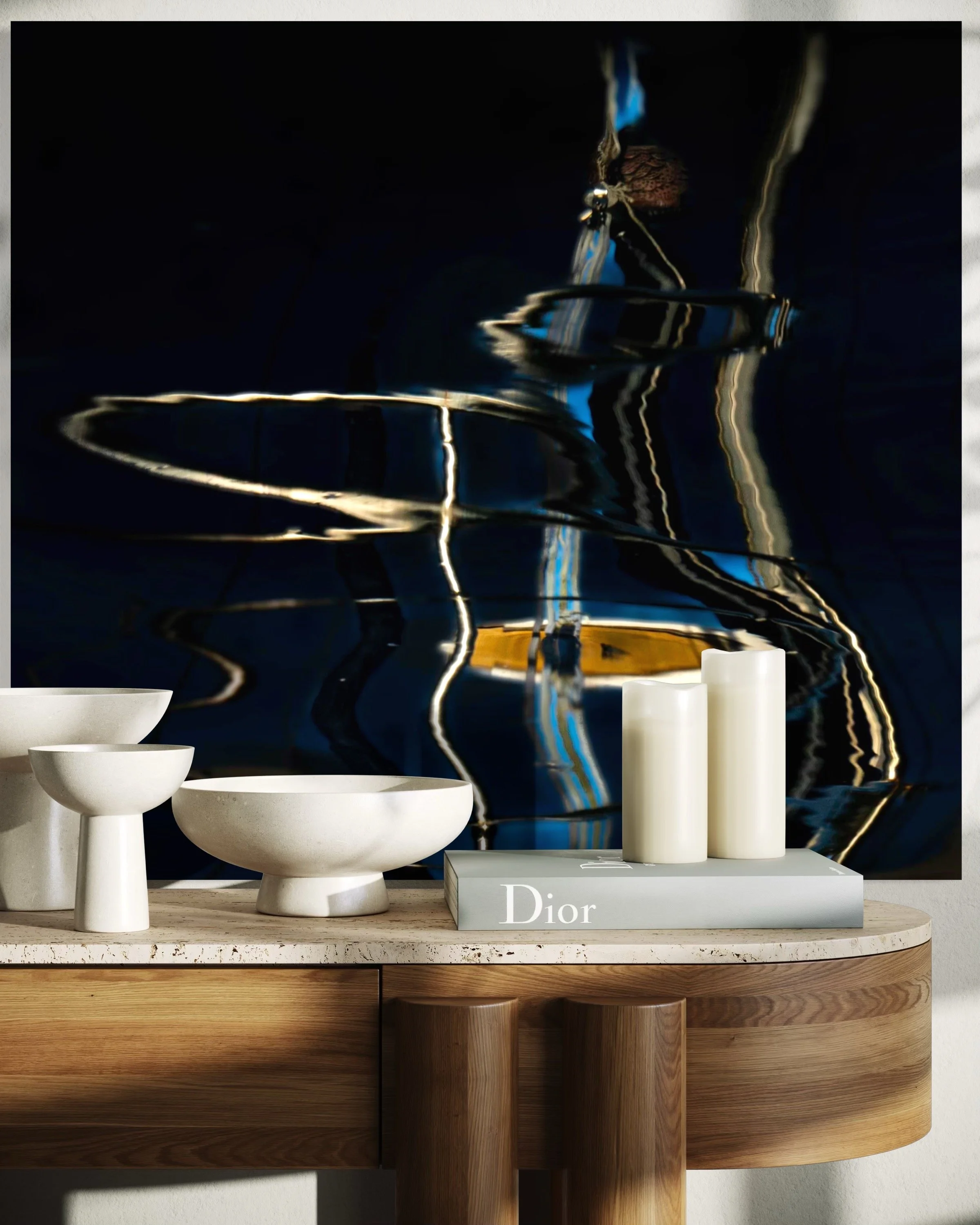 3. Evoked Idea: For me, “Liquid Resonance” evokes a feeling of quiet intensity — a moment suspended between calm and movement. There’s a sense of mystery beneath the surface, as if the water is translating unseen energies into shifting light and form. Emotionally, it feels meditative yet alive — the kind of stillness where you can almost hear the silence hum. The distorted reflections suggest the fluid nature of perception — how reality bends, reshapes, and reflects differently depending on where we stand. It also carries a sense of connection: between light and water, matter and vibration, the seen and the sensed. There’s beauty in its ambiguity — a rhythm that feels both natural and otherworldly, like the quiet pulse of life beneath the surface of things.