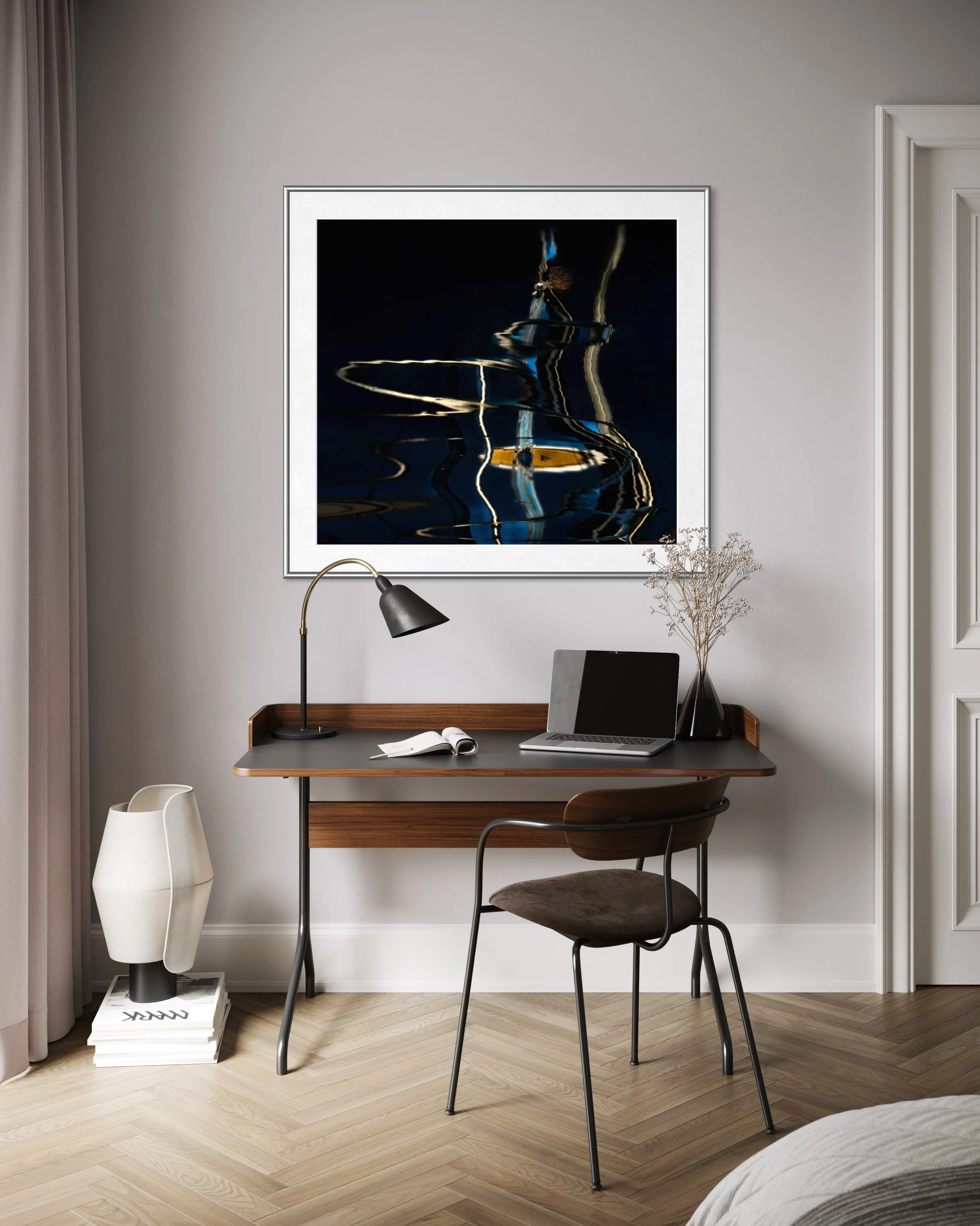 2. Title Reason: When I looked at the image, I felt an immediate sense of vibration — as though light itself was humming through the surface of the water. The reflections aren’t static; they bend and pulse, creating rhythmic waves of line and color that feel almost musical. The deep indigo tones give the image a meditative depth, while the golden and ivory highlights ripple like sound made visible. The title “Liquid Resonance” expresses that interplay — the idea that water holds memory, vibration, and energy. It’s not just reflecting what’s above, it’s responding — resonating — to it. The image feels like a visual echo of something unseen, a moment where light and movement find harmony in fluid form.