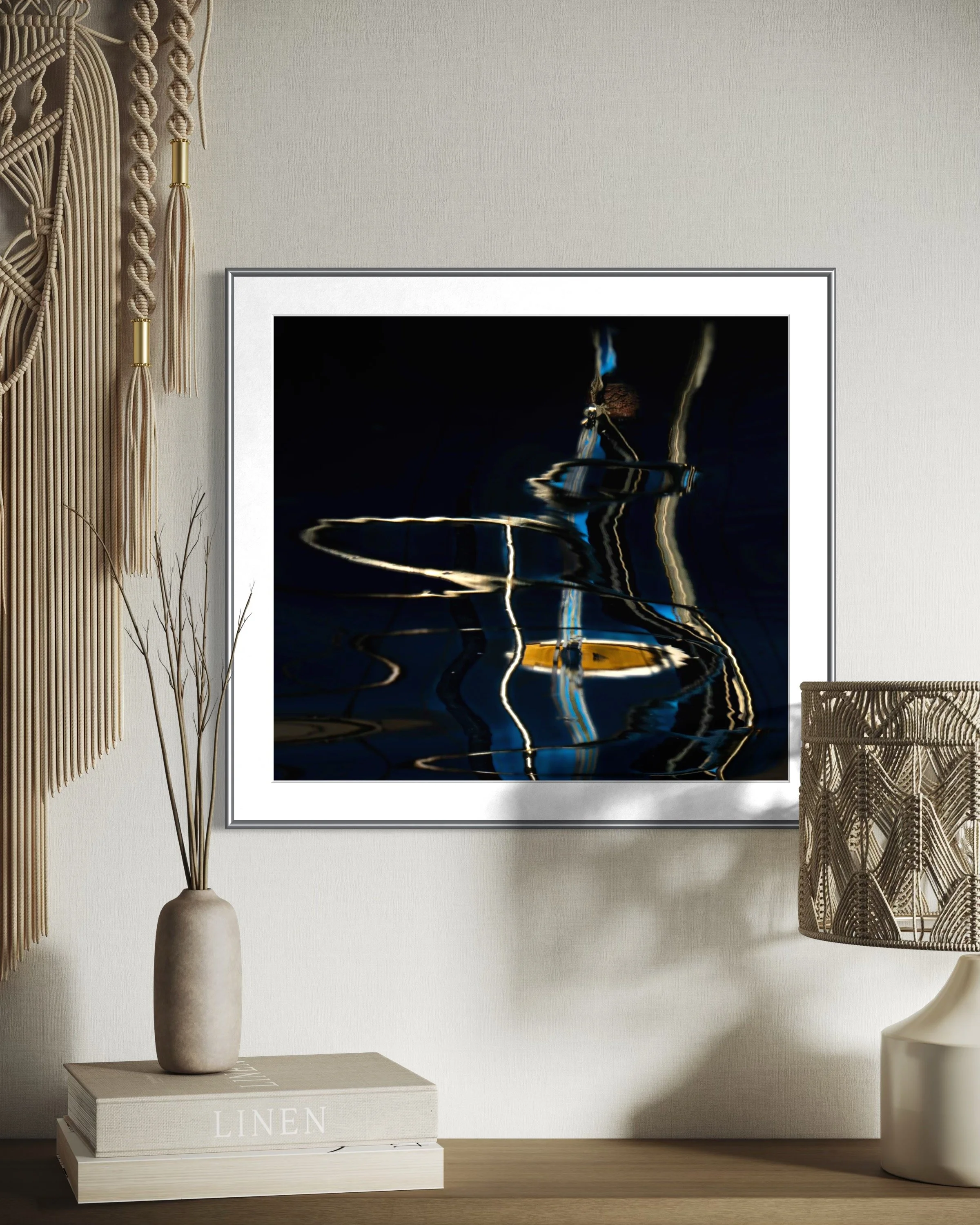 This piece represents a moment of stillness in time — yet the vertical and horizontal lines move energetically between the past and future.