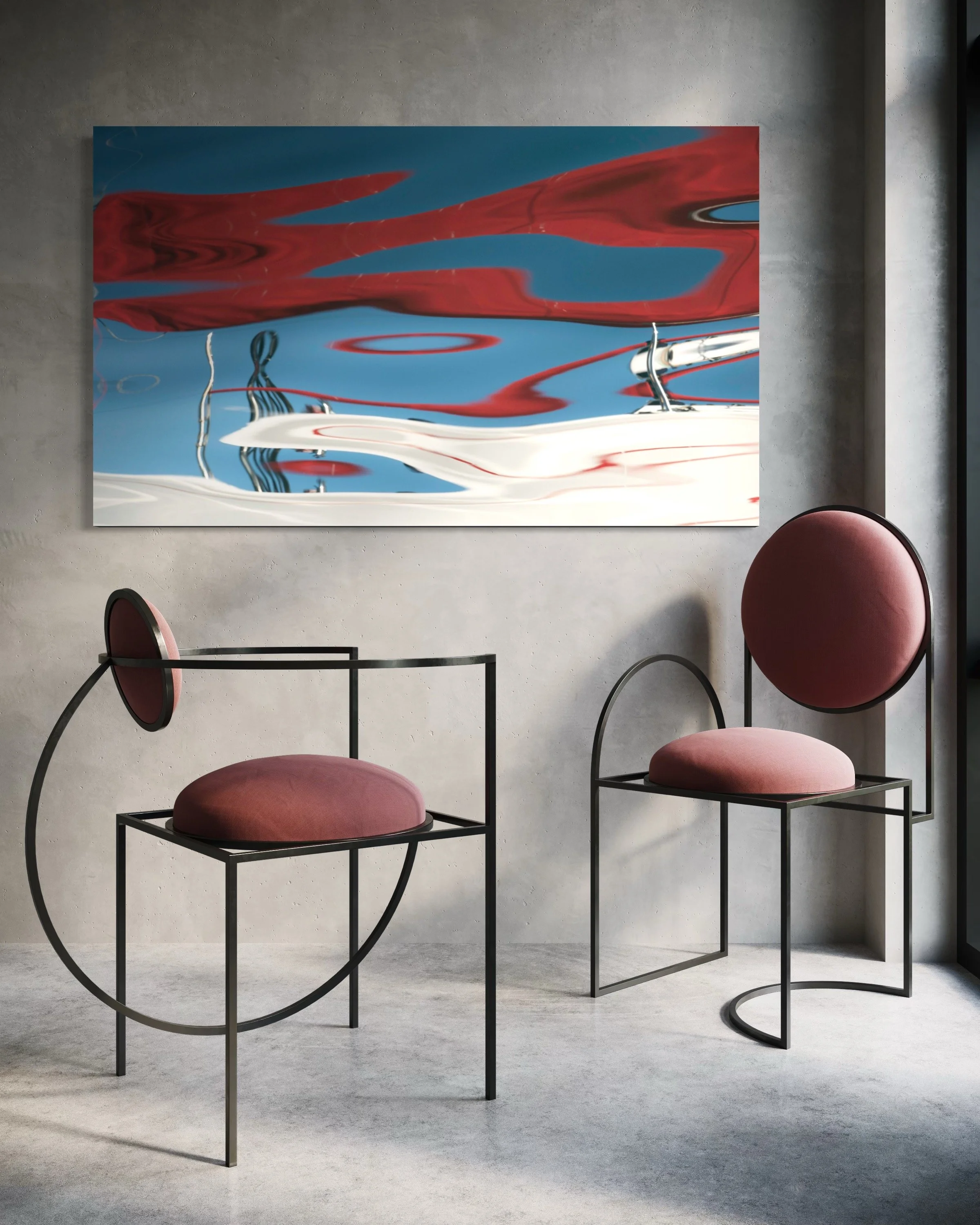 The clean, industrial backdrop here allows the artwork to take center stage. The deep blues and rich reds contrast beautifully with the neutral tones, while the geometric forms in the furniture echo the fluid distortions within the piece. There’s a sense of movement here—like Venus shaping the space, drawing the eye through her tide-like presence.