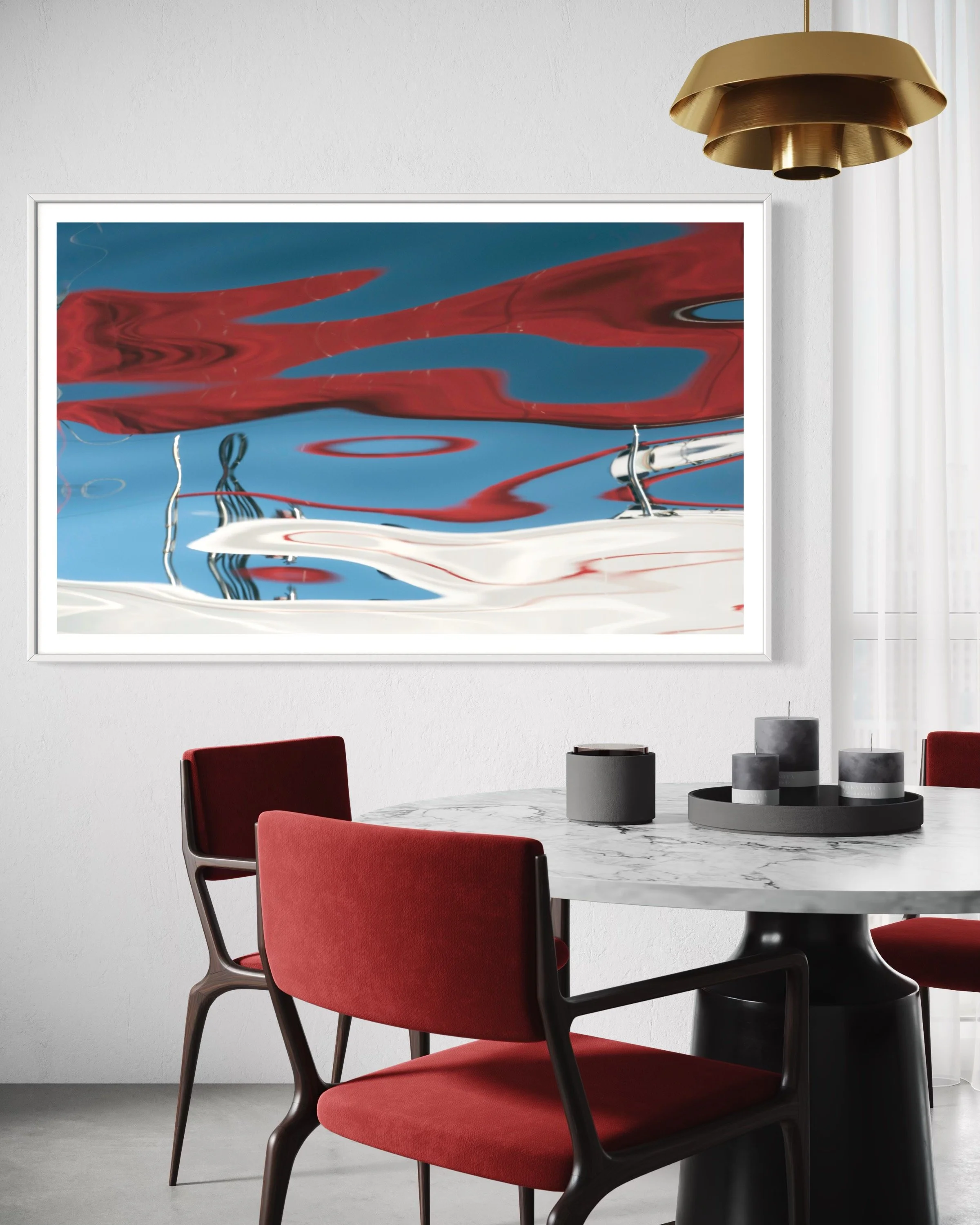 This is where Tides of Venus truly comes alive. The red of the bathtub mirrors the bold strokes within the artwork, creating a perfect dialogue between the two. The play of natural light across the surface means the piece will change throughout the day, just as water itself is never still. Here, Venus embodies relaxation, reflection, and a deep connection to the elements.
