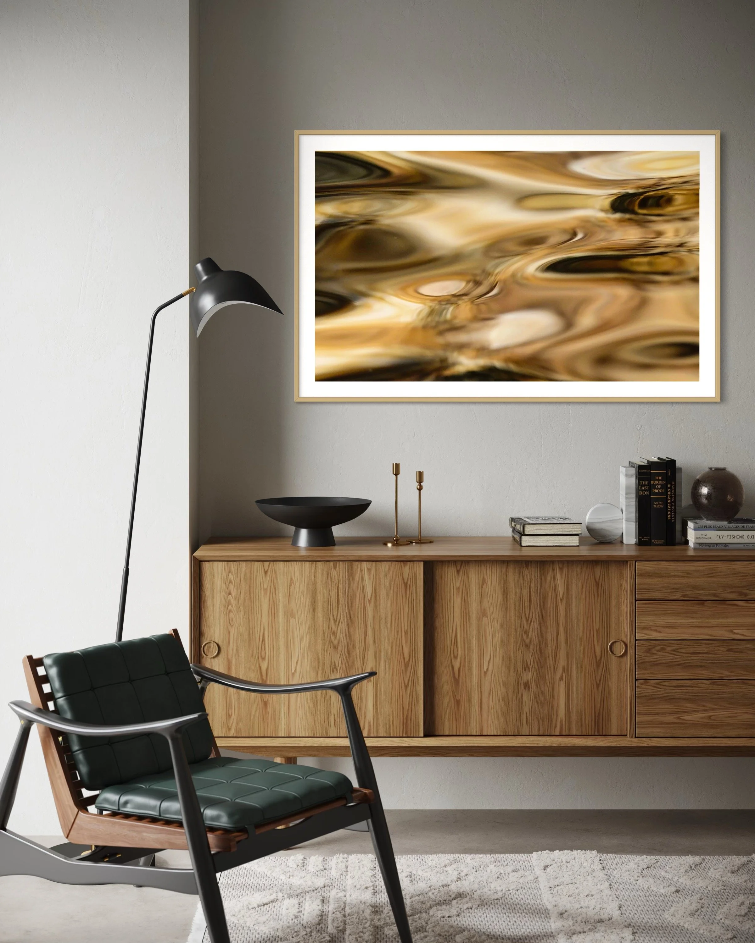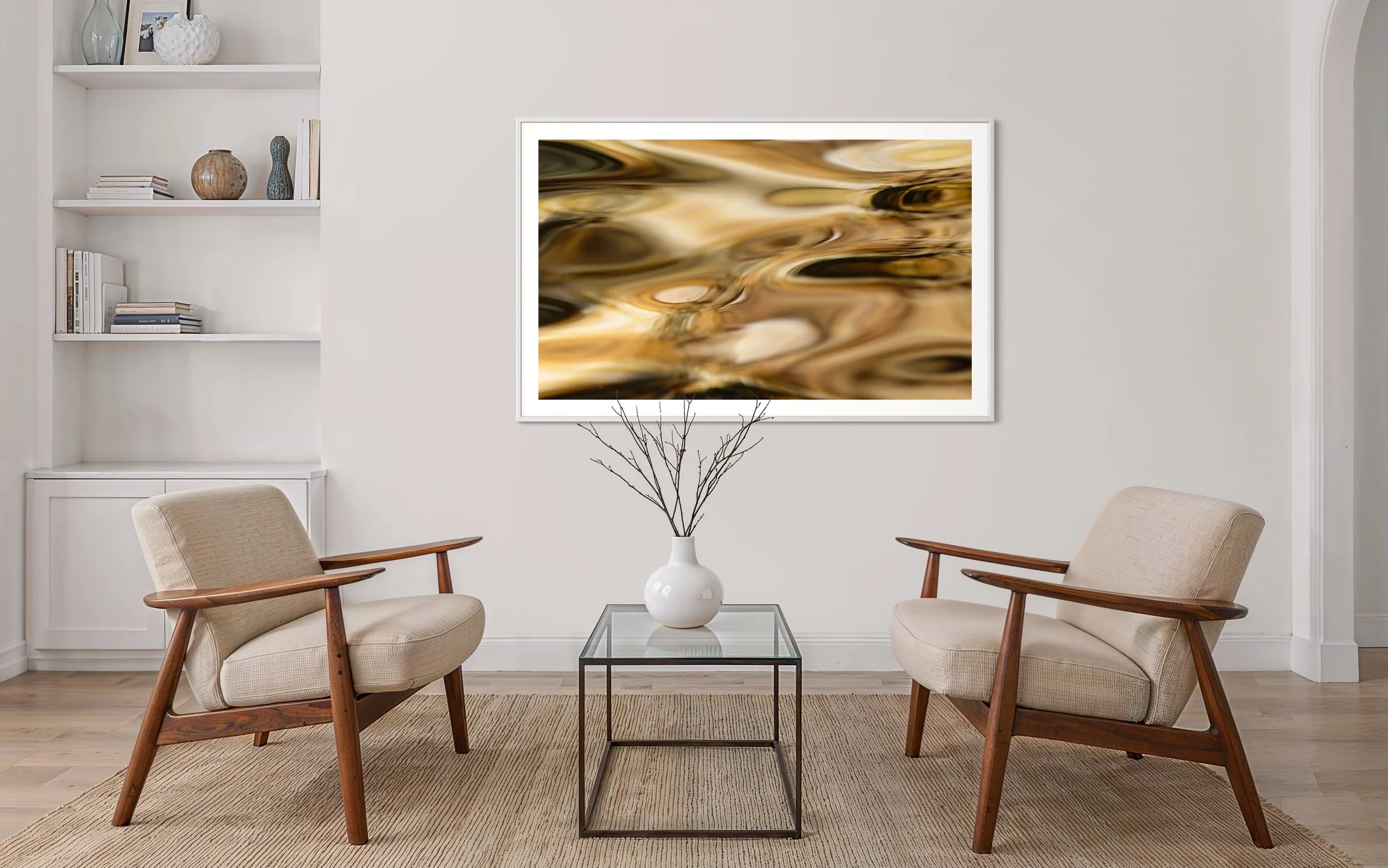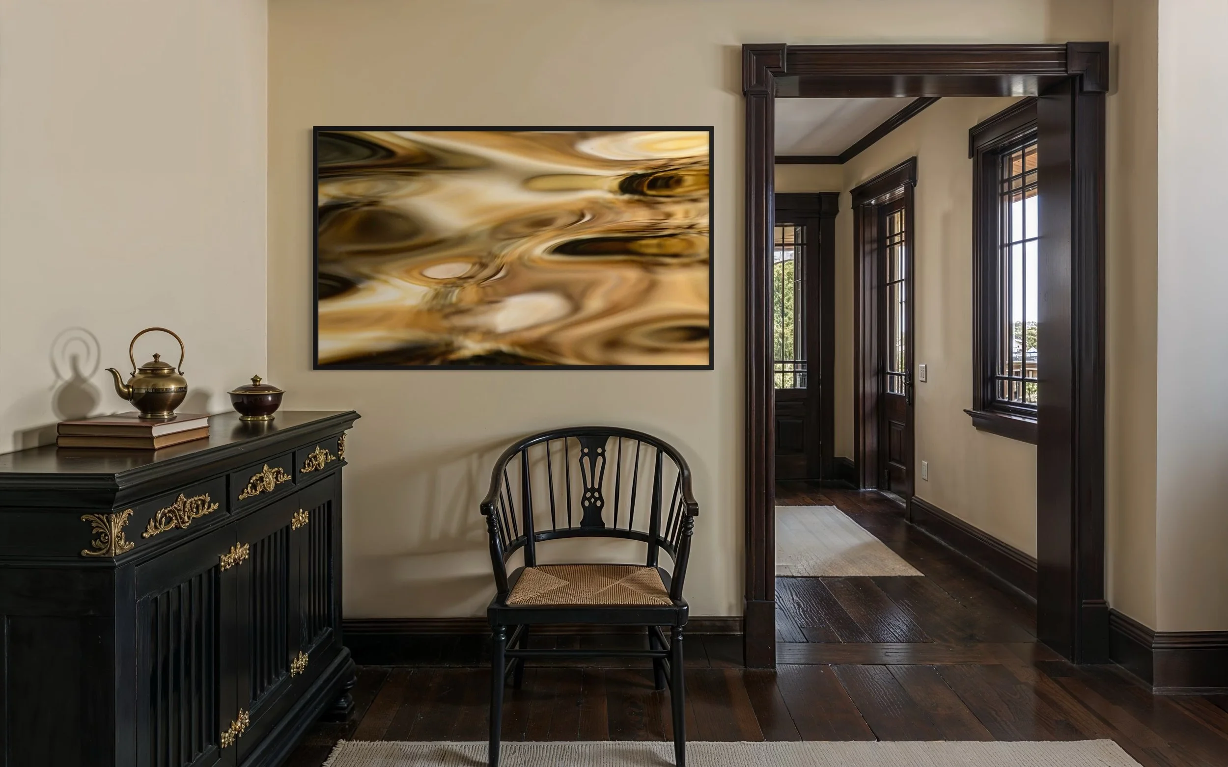 The naming of the work was not straightforward. At first, I was struck by sandstone’s shimmer, its ochres and golds. But as the reflection unfolded, it became something else: water becoming land, sandstone becoming map. From that recognition emerged a deeper connection to ancient motifs, marks that seem at once fleeting and timeless.