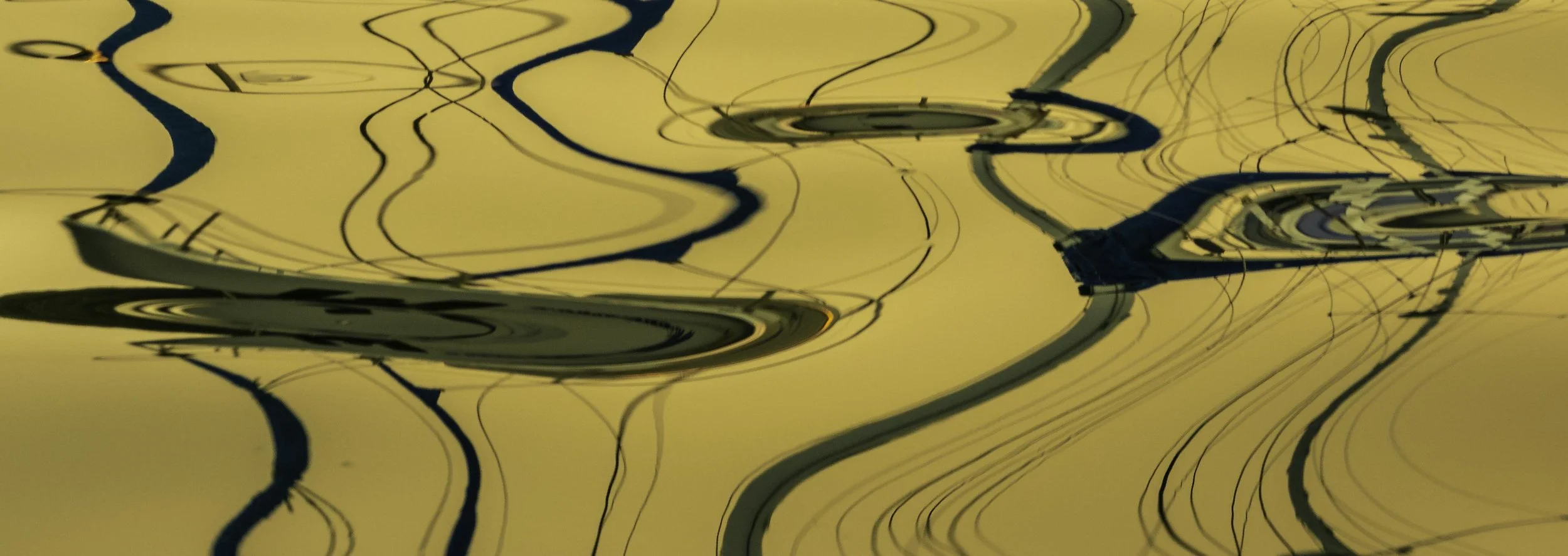 I was drawn first to the field of gold — an expanse that felt both ancient and immediate. Gold carries the weight of manuscripts, icons and sacred objects, yet here it appeared fluid, unstable and alive on the surface of water. Then the lines began to reveal themselves. At first glance they seemed incidental — distortions of masts, rigging and structures reflected on water. But the longer I stayed with the image, the more they began to organise themselves into something else entirely. They started to behave like notation. Like a score.